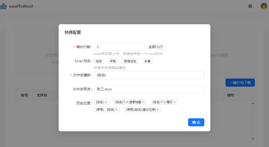 4、上传完毕后配置导出word的文件名称(自动读取excel列数据),支持多行合并到一个word文件中。