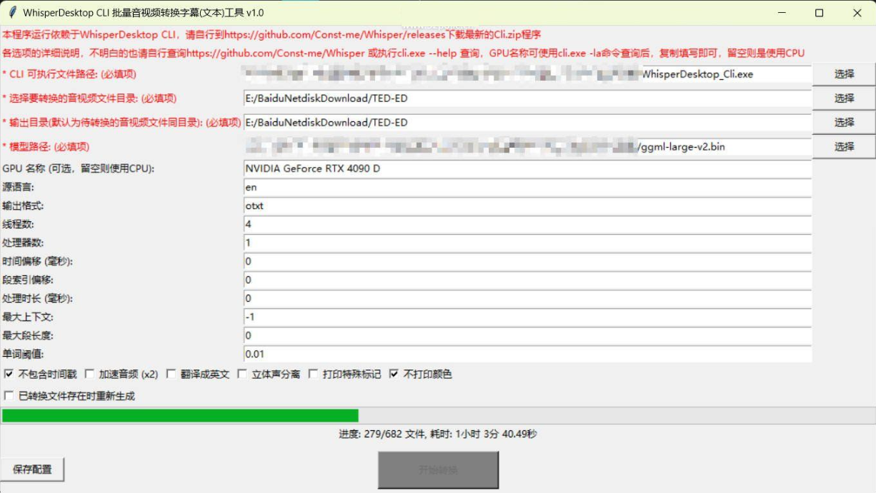 最近在论坛看到一个Ted的视频,有600多个,想生成字幕,但Buzz的话,只能使用CPU,WhisperDesktop的话,又只能一个个转,在研究了WhisperDesktop的github后,发现原来还有一个cli程序,那就好办了,写个工具,调用cli,进行批量转换的。实际上,懂脚本的人,写个脚本也是几行代码就可以进行批量转换,写个GUI的是方便不会脚本的人使用。