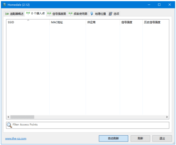 3.功能强大:Homedale提供了查看所有可用接入点的概述及其信号强度、安全性(WEP/WPA/WPA2)、网络名称(SSID)、基于MAC地址的供应商、通道、支持的数据速率等详细信息。