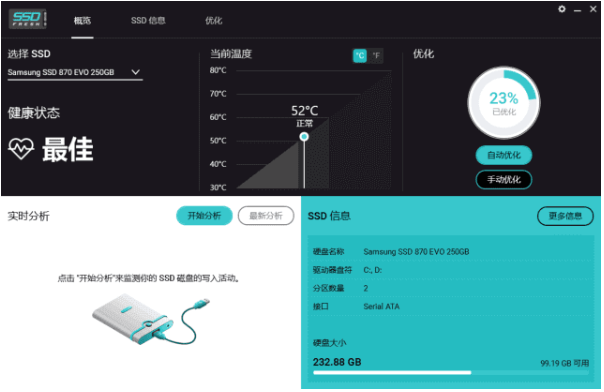 - 查看SMART数据:现代硬盘使用SMART系统进行自我监控,SSD Fresh读取此信息并显示在窗口中。